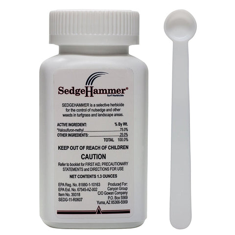 SedgeHammer herbicide kills nutsedge without injury to turfgrass, established ornamentals, shrubs, and/or trees. SedgeHammer provides post-emergence control of both purple nutsedge and yellow nutsedge. SedgeHammer also controls many broadleaf weeds and suppresses kyllinga. Nutsedge is controlled after emergence in cool and warm season turf grasses such as St. Augustinegrass, Bermudagrass, Kentucky Bluegrass, tall and fine fescue, and perennial ryegrass. Sedgehammer is considered one of the more "gentle to turfgrass" products and pets and people can return to the treated area once the spray dries.