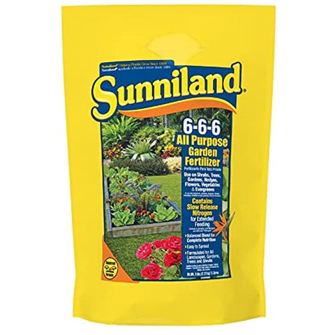Sunniland 6-6-6 All purpose features a slow release formula that feeds your plants, trees, vegetable gardens and lawns. Use 6-6-6 All purpose for your complete lawn care needs. Easy to apply granular fertilizer. Use this formula year around.